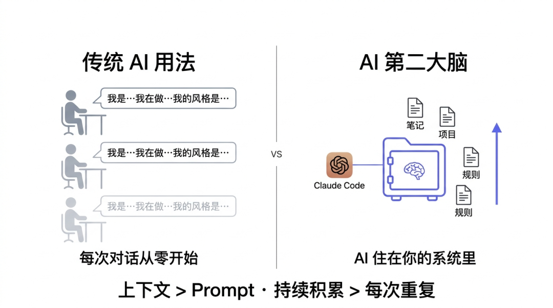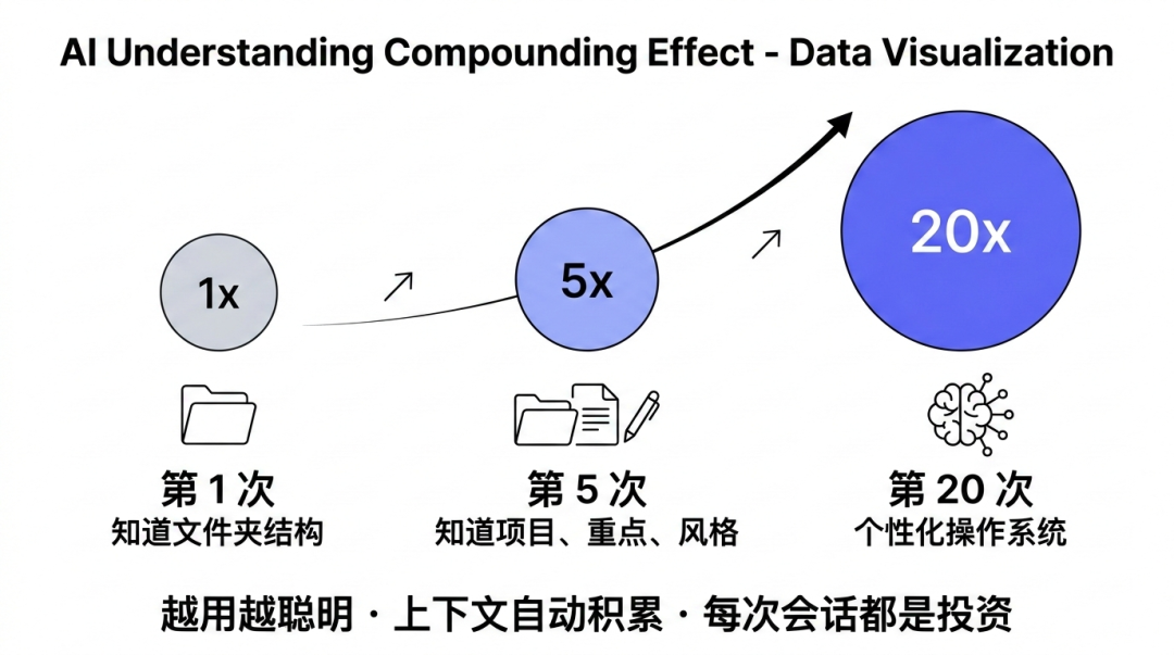当你的 AI 了解你的文件结构、项目、写作风格和整个知识库时,它的输出质量会发生质变。而这种理解是可以积累的——每一次会话都让系统更聪明、更个性化、更贴合你的思维方式。