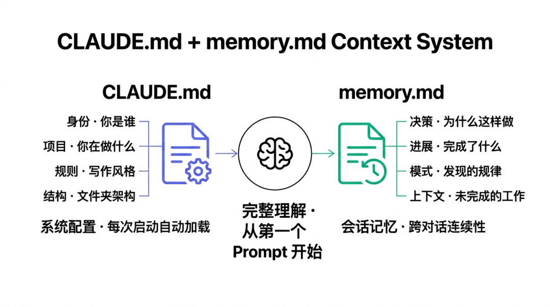 memory.md是Claude在每次会话结束后记录关键决策、模式和进展的地方。它提供了跨会话的连续性。