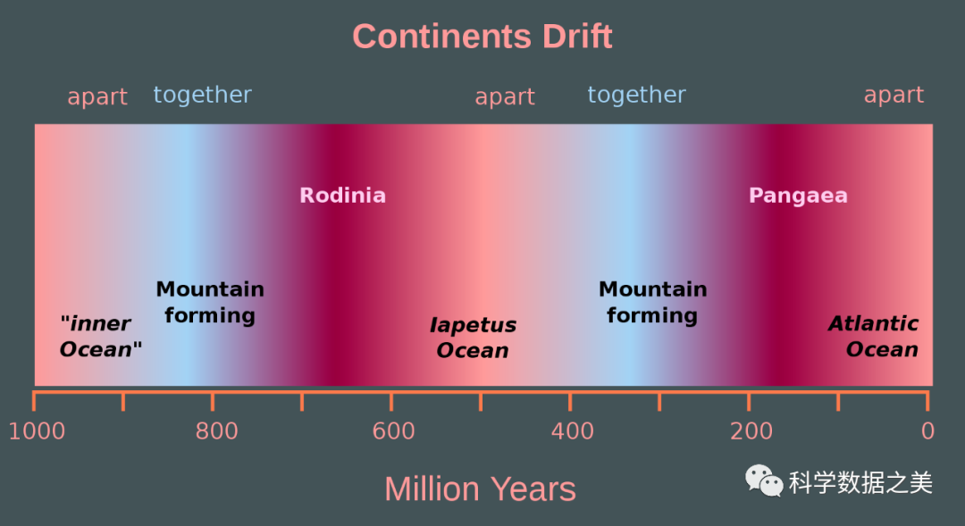 根据板块构造理论,地球的表面是由岩石板组成的,这些岩石板就在我们的脚下慢慢移动。由于这种不断地运动,今天的地球看起来与数百万年前有很大的不同。下面这段视频动画展示了地球板块从10亿年前的地质学时间到现在的变化过程。该视频时长40秒钟,从10亿年前(1000Ma)开始,每秒约2500万年的速度展示变化情况。