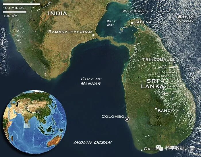 印度洋保克湾和马纳尔湾之间美丽的彩色浅水和珊瑚礁。连接印度与斯里兰卡的罗摩桥或称亚当桥(Rama’s Bridge or Adam’s Bridge)其实并不是一座真的桥梁,而是水底清晰可见的岩礁和石灰岩沙洲。#Sentinel2(此处还有一个传说,有兴趣的可以搜一下。)