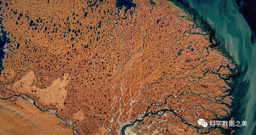 It shows the Lena Delta situated in the Sakha Republic in Siberia. With a size of 30,000 km2, it is considered one of the largest river deltas in the world.