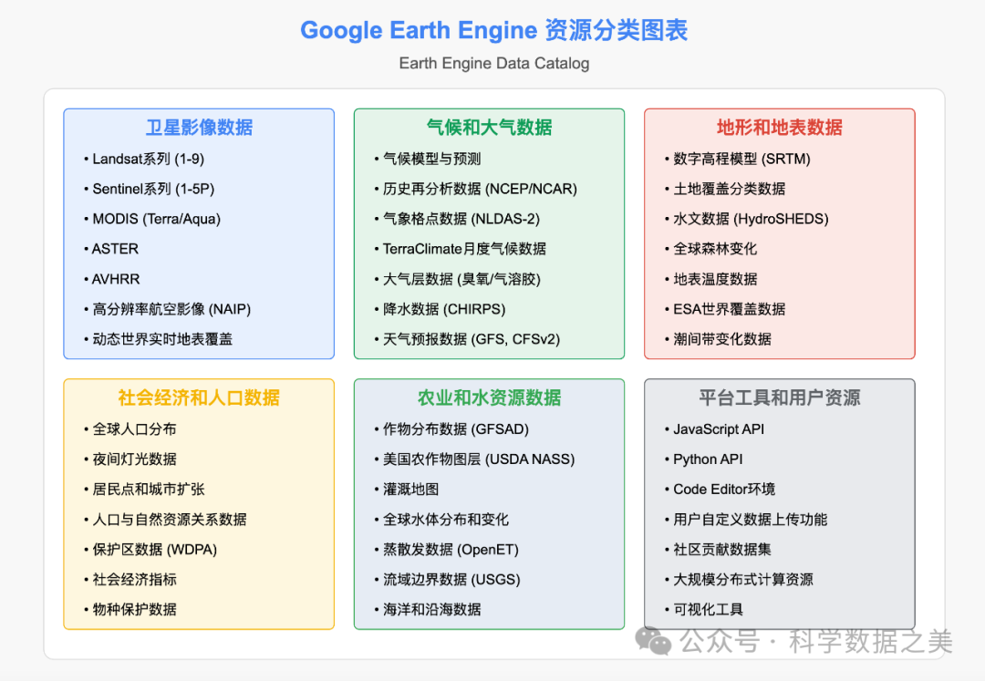 Google Earth Engine(GEE)是一个基于云计算基础设施的地理空间数据分析平台,专为处理海量地球观测数据而设计。该平台集成了超过40PB的卫星影像和地理空间数据集,以及用于分析这些数据的高性能计算能力。 GEE的数据目录包含了从1972年至今的完整Landsat系列档案、完整的Sentinel-1/2/3/5档案、MODIS数据产品、气候和天气数据集、土地覆盖数据、社会经济数据集等。