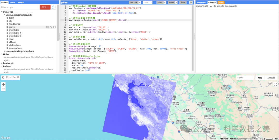 // 导出结果到Google DriveExport.image.toDrive({image: ndvi,description: 'NDVI_SF_2020',scale: 30,region: image.geometry(),maxPixels: 1e13});