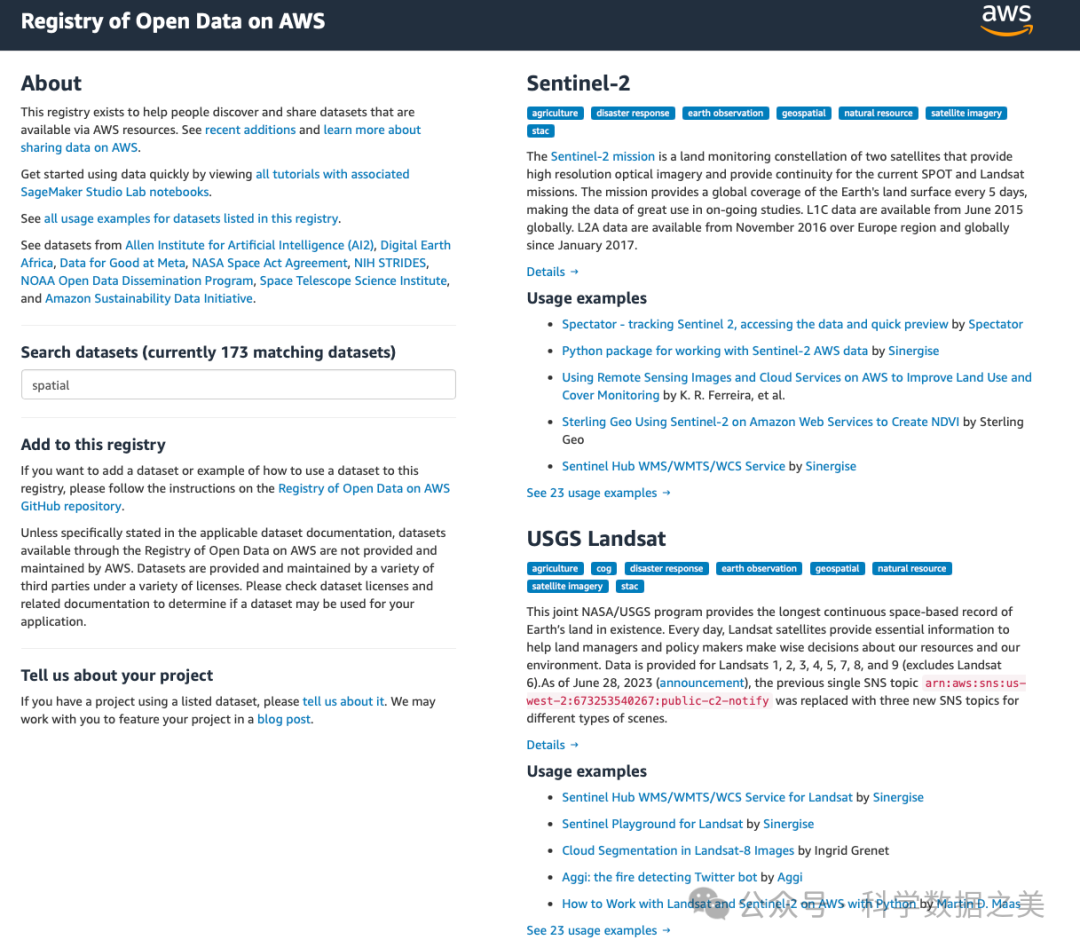 亚马逊AWS的开放数据计划通过AWS云计算基础设施托管关键的地理空间数据集,使公众能够免费访问和分析这些数据。 该项目目前托管了数百个数据集,涵盖地球观测、天气和气候、生命科学、政府数据等领域。