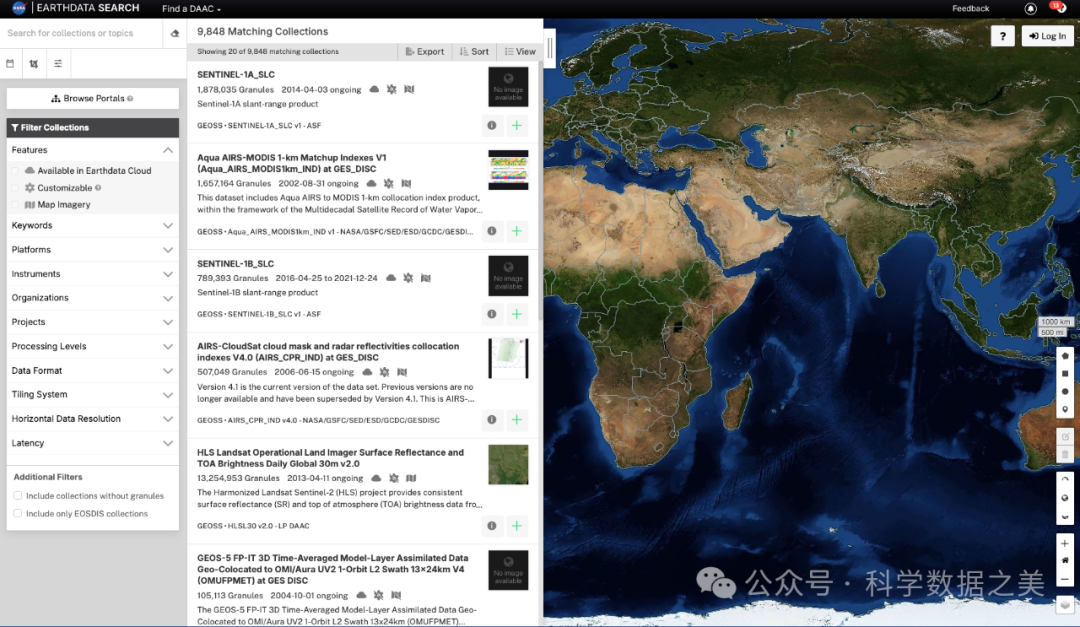 - • NASA特定任务数据和科学产品: 选择NASA CMR