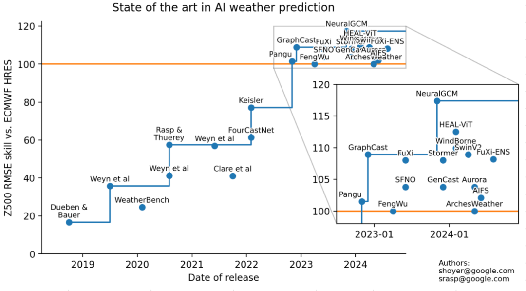 相对于IFS HRES(欧洲中期天气预报的黄金标准)的技能进展。可以看到,对于某些指标(例如3天期850毫帕温度RMSE),这些AI模型实际上超越了经典的基于物理的模型。