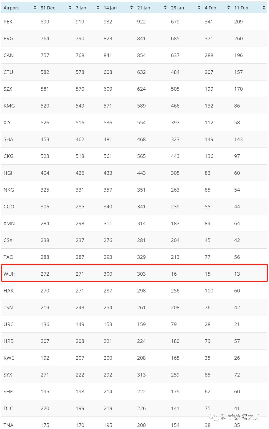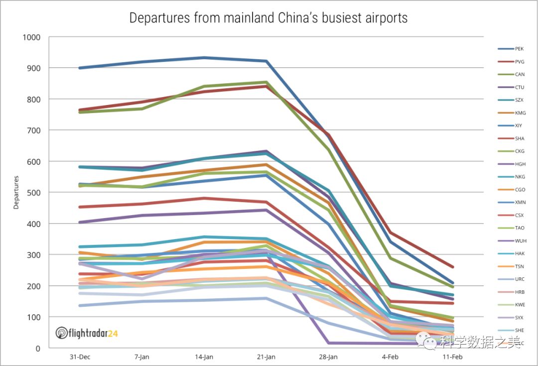1月21日,有10,522班航班从中国25个最繁忙的机场起飞(请参见下面的列表)。在2月11日,只有2,123班航班从这些机场出发。北京的流量下降了近80%,上海的流量下降了70%,广州的流量也下降了近80%。