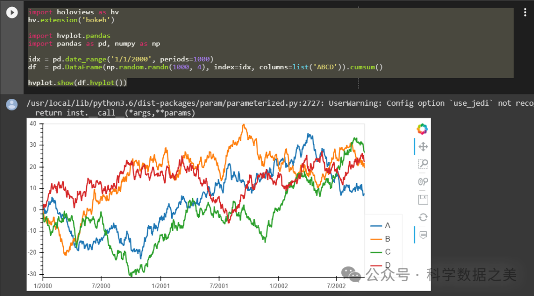 • hvPlot: 基于HoloViews构建,提供了一个更简单的API来创建交互式图表。它与pandas、xarray等数据结构无缝集成,使得从数据到可视化的过程变得非常直观。hvPlot支持多种图表类型,并提供了方便的定制选项。