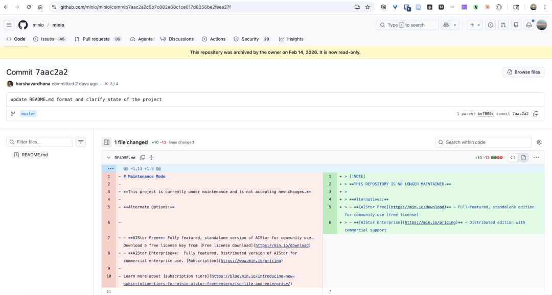 2026年2月14日,MinIO在GitHub仓库的README中写下了一句话: