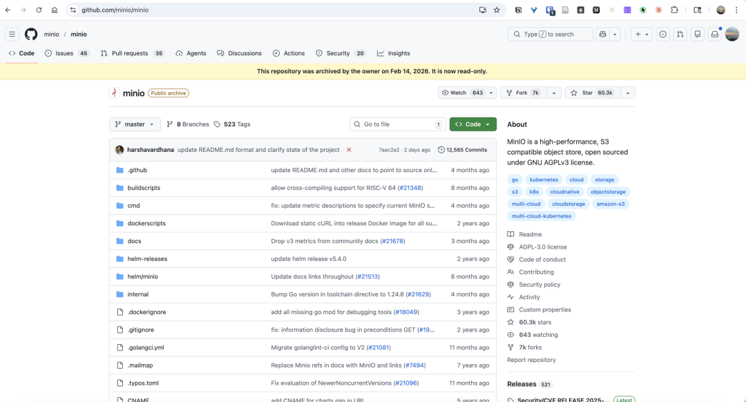 六万颗Star,十亿次Docker镜像下载,一个曾经最受欢迎的S3兼容对象存储项目,就这样被它的创建者亲手送进了坟墓。