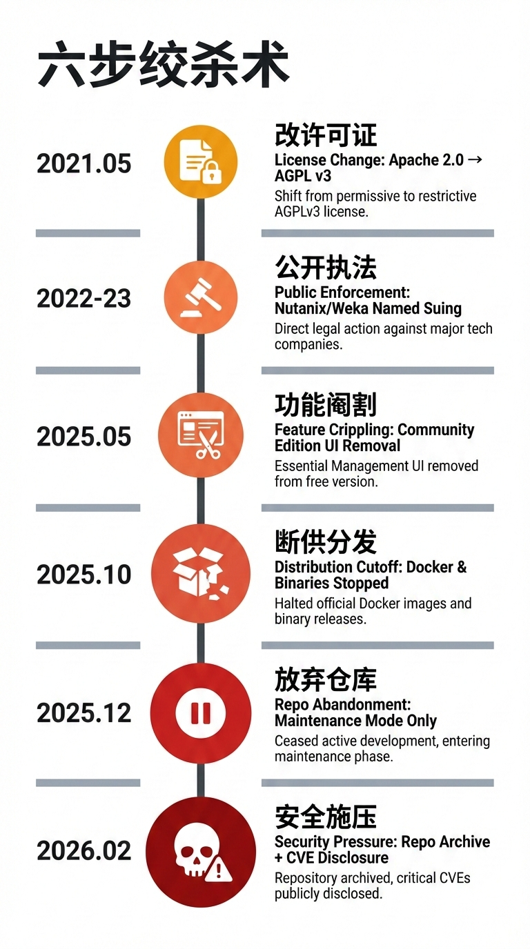 | 2022-2023 年 | 公开起诉 Nutanix、Weka 等公司 | 社区信任开始动摇 |