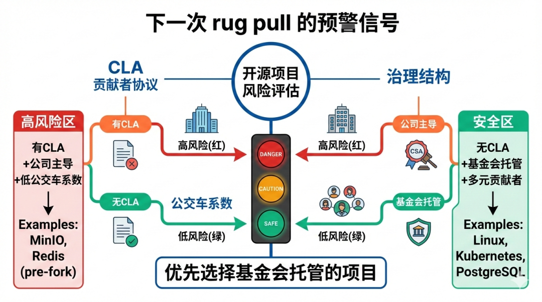 - • 警惕要求签署 CLA 的公司主导项目 — 这是一个信号,说明公司保留了未来变更许可证的权利